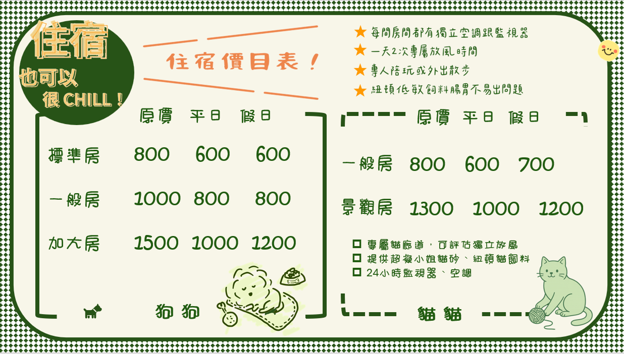 A:房內空間提供專屬 24 小時監視器,飼主可於住宿期間遠端查看自家毛孩狀況,以增加安心感。