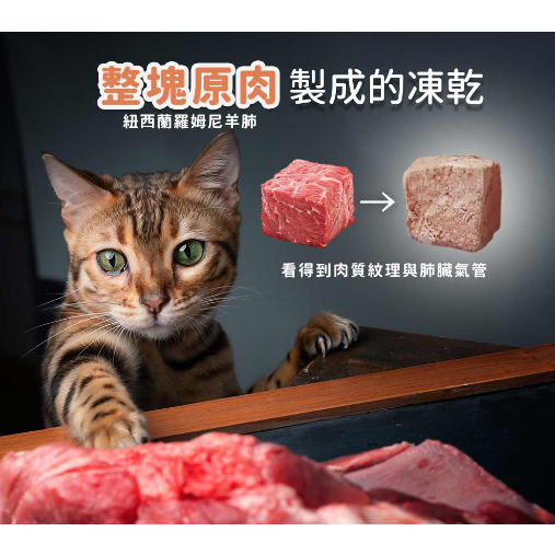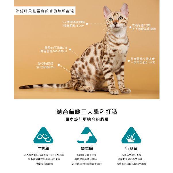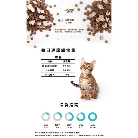 粗蛋白最少40%、粗脂肪最少18%、粗纖維最多6%、水分最多10%、粗灰分最多10%、鈣最少1.0%、磷最少0.8%、鎂最少0.04%、鈉最少0.2%、牛磺酸最少0.1%