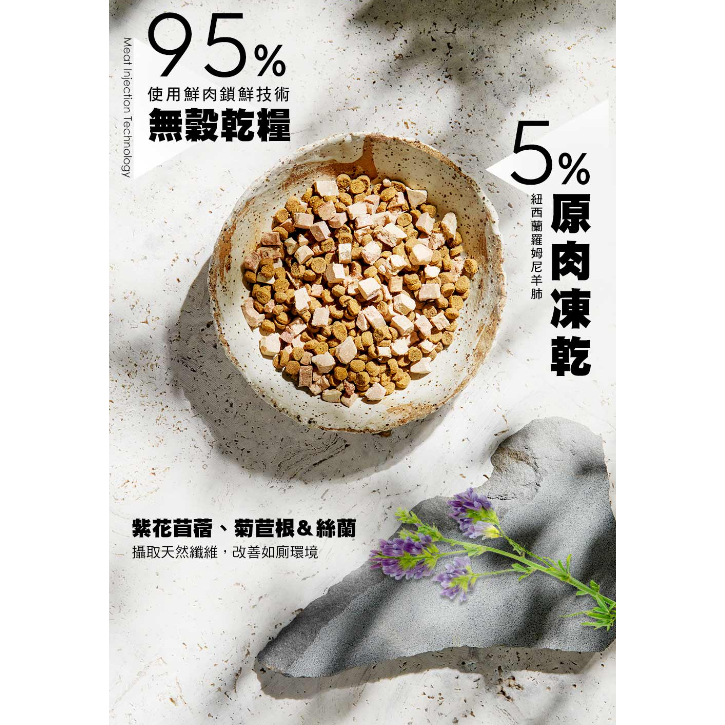 尖吻鱸魚肉、鮭魚粉、魚粉、牛油、沙丁魚粉、扁豆、鷹嘴豆粉、豌豆、冷凍乾燥羊肉(羊肺)、鮪魚粉、豌豆蛋白、蠶豆蛋白、木薯澱粉、水解物(牛水解液、水解魚蛋白粉)、甜菜漿、纖維素纖維、鹽、維生素和礦物質、磷酸氫二鉀、苜蓿草、菊苣根、牛磺酸、蛋氨酸、天然抗氧化劑、絲蘭提取物