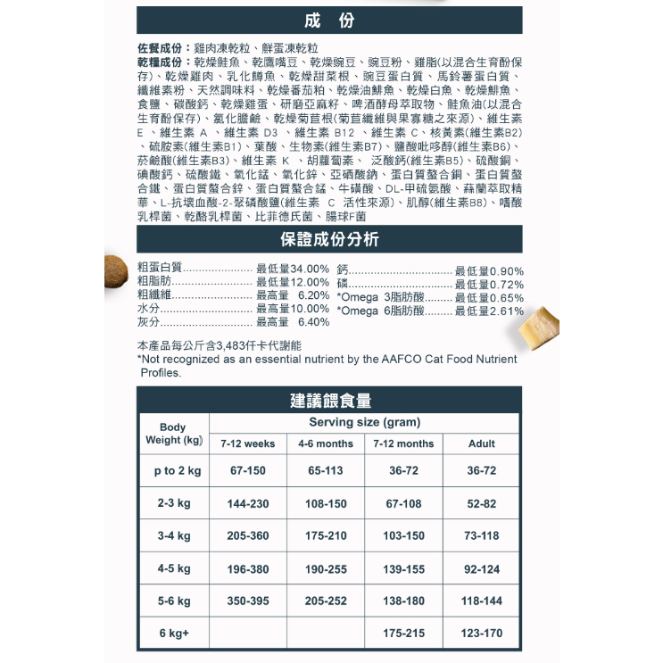 嚴選海魚+雞肉雙蛋白,天然低敏、好消化,特別適合挑嘴貓、腸胃敏感或需要高營養密度的貓咪。 蛋白質高達 34%,搭配 Omega 3・6,有助肌肉發展、皮毛健康與免疫力維持,成貓與幼貓皆適合。