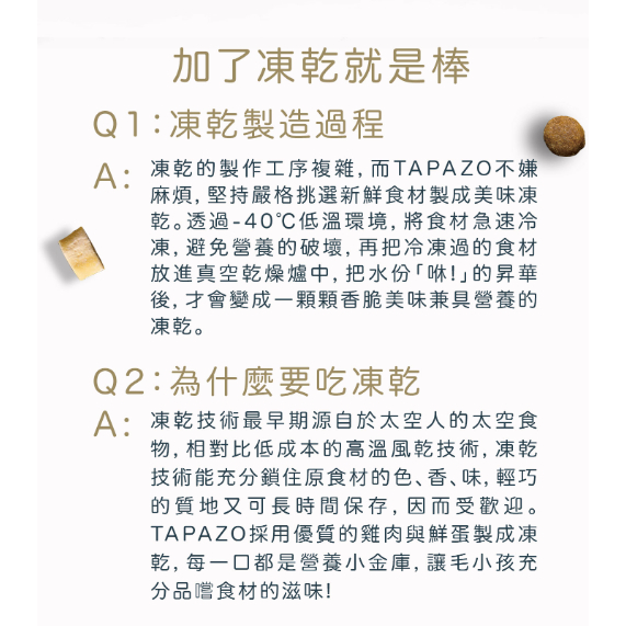 嚴選單一雞肉蛋白,低敏、好消化,適合成貓、挑嘴貓與腸胃敏感貓咪。 凍乾製程完整保留營養與肉香,蛋白質高達 33%,無人工添加,讓貓咪吃得安心又健康。