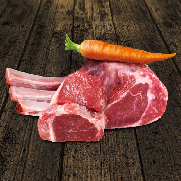 水、雞肉、牛肉、胡蘿蔔、雞肉脂肪、羊肉、木薯澱粉、牛肝、蔬菜纖維、酵母萃取物、鹽、纖維素粉、葡萄糖、魚湯、愛爾蘭海藻膠、瓜爾膠、β-胡蘿蔔素
