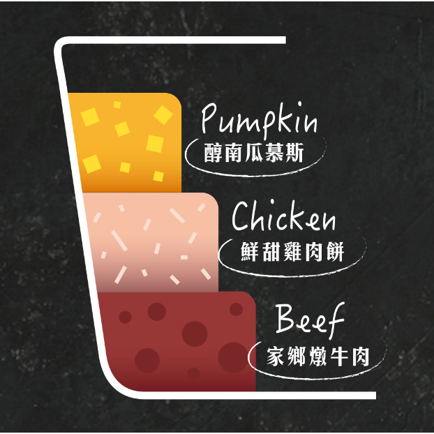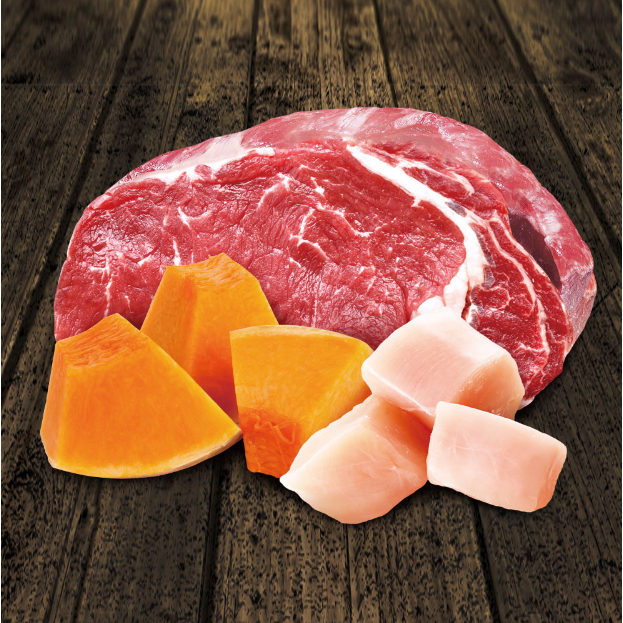 水、雞肉、牛肉、雞肉脂肪、南瓜、木薯澱粉、牛肝、蔬菜纖維、酵母萃取物、鹽、纖維素粉、葡萄糖、魚湯、愛爾蘭海藻膠、二氧化鈦、瓜爾膠、薑黃粉