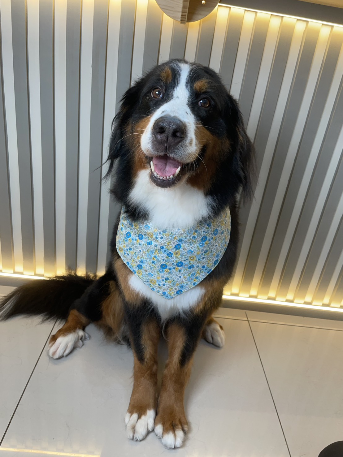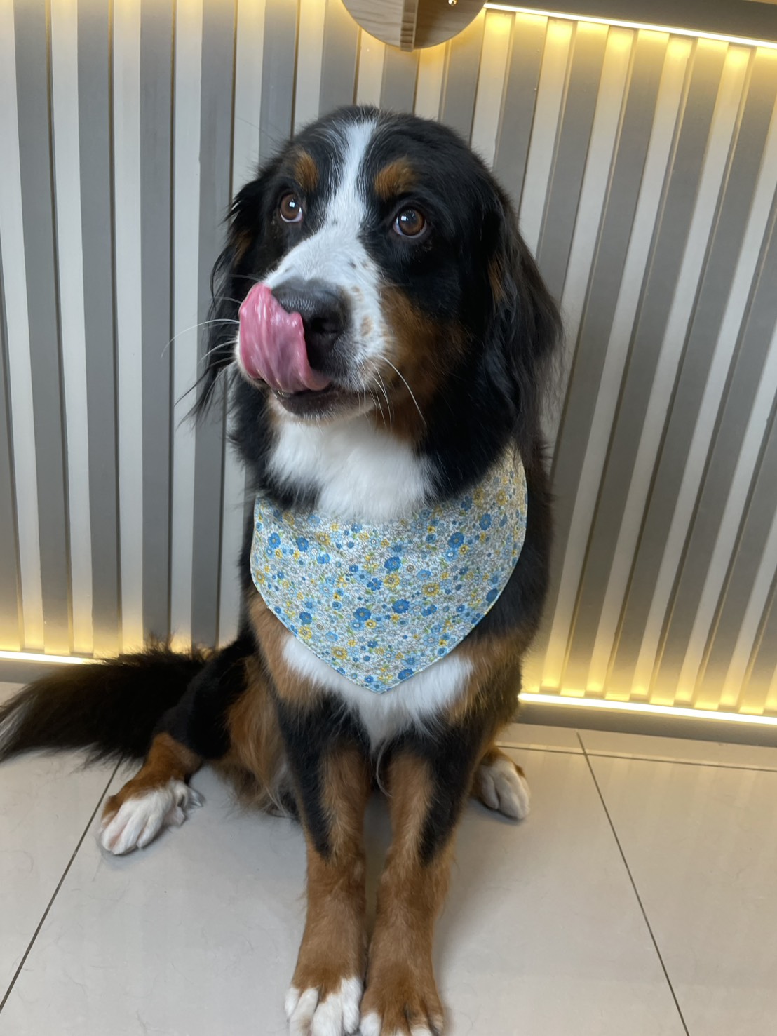 彷彿把一座小花園戴在脖子上,藍色與鵝黃花朵低調卻耐看,充滿溫柔細節。領巾版型服貼、不厚重,為毛孩增添自然可愛的日常穿搭感。