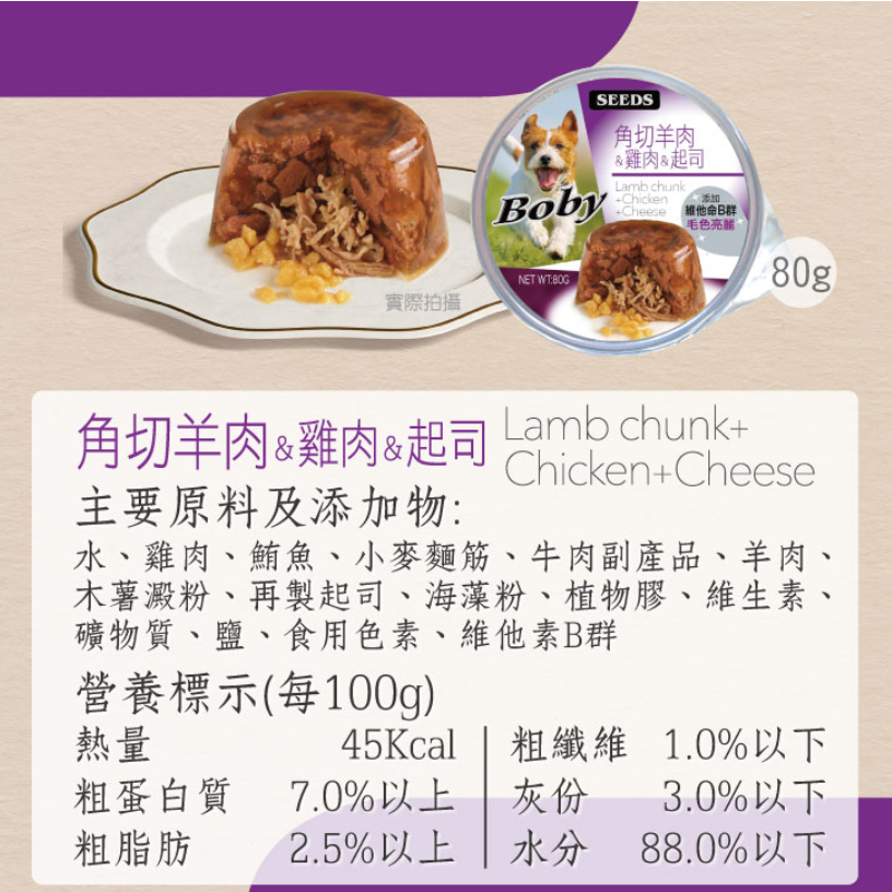 主要原料及添加物:水、雞肉、牛肉、地瓜、海藻粉、植物膠、維生素A
