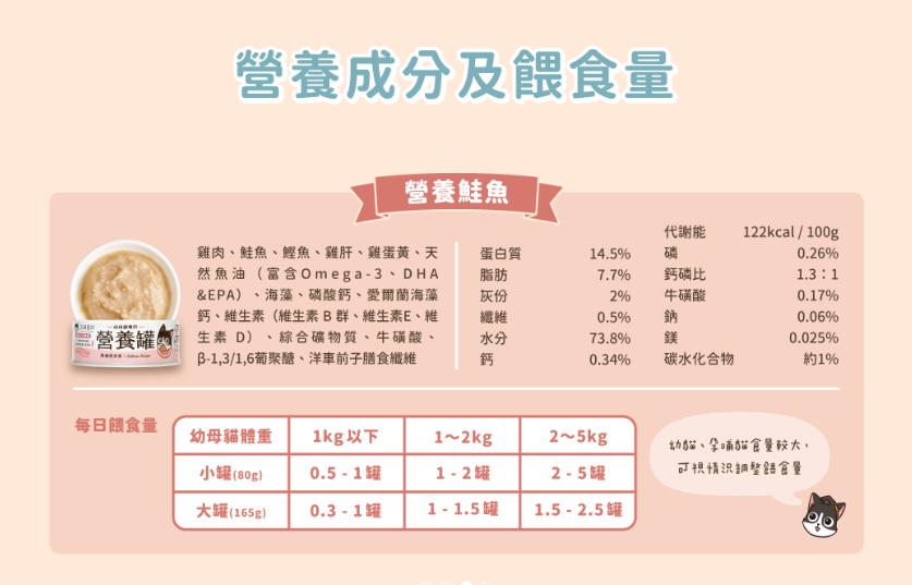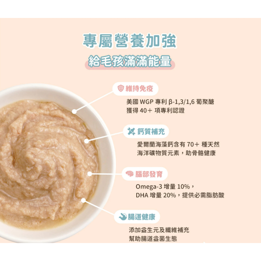 嚴選雞肉搭配鮮嫩鮭魚,提供高品質動物性蛋白,並富含天然 Omega-3(DHA・EPA),幫助維持皮膚健康、毛髮柔亮。口感細緻好入口,適合作為每日主食。
