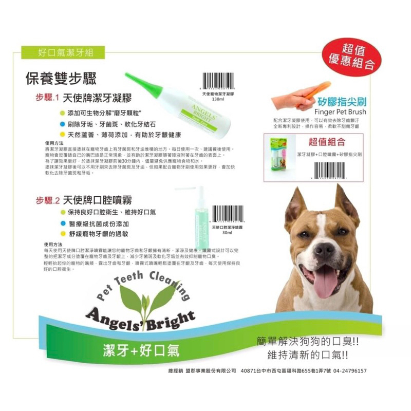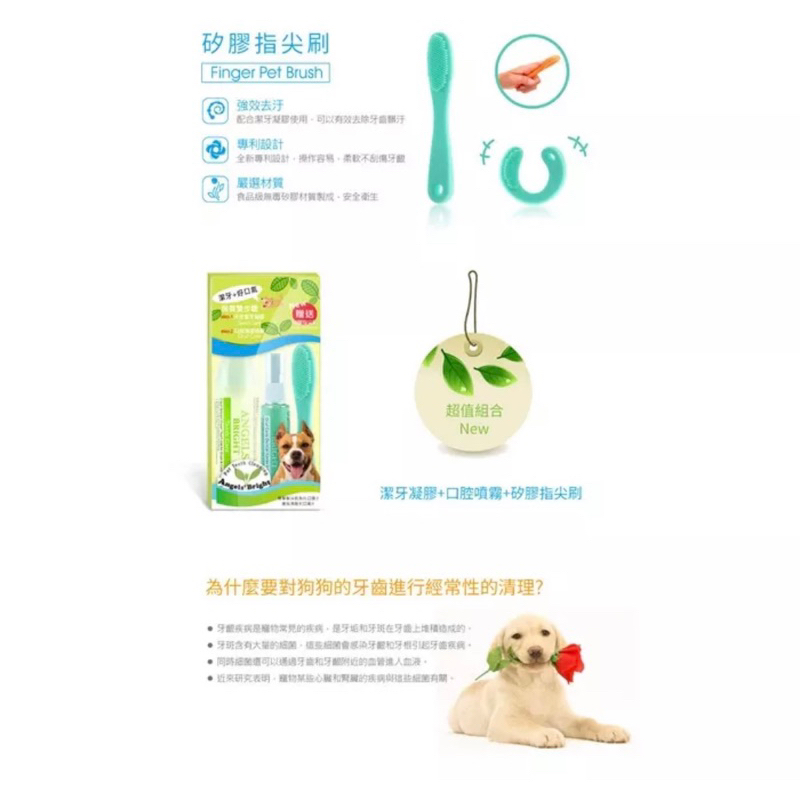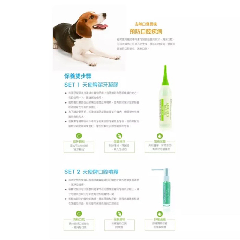 ▼ 塗抹潔牙凝膠後可以不用牙刷來去除牙菌斑及牙垢,但如果配合寵物牙刷使用效果更好。 2天使牌潔牙噴霧每天使用天使牌口腔潔淨噴霧能讓您的寵物牙齒和牙齦擁有清新、潔淨及健康。